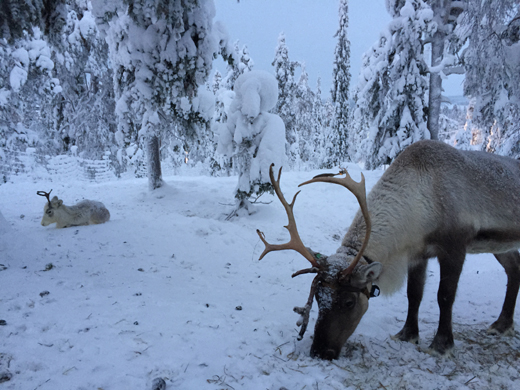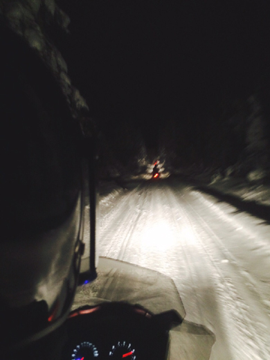 Na een heerlijke warme maaltijd, met uiteraard rendiervlees op het menu, trekken we de overalls aan die we bij aankomst in Ruka overhandigd kregen. Hoewel het deze dagen met -5 graden warm is voor de tijd van het jaar, komen de dikke pakken goed van pas. We gaan namelijk op de sneeuwscooter door de Finse taigabossen. Op zoek naar het noorderlicht, zo stond er in het programma te lezen. Maar dat kunnen we door de bewolking helaas op onze buik schrijven. Een kleine smet op de feestvreugde, maar het maakt de tocht er niet minder leuk om. We schieten over dichtgevroren meren, sturen behendig langs besneeuwde naaldbomen en eten onderweg ons zelf opgewarmde vlees.